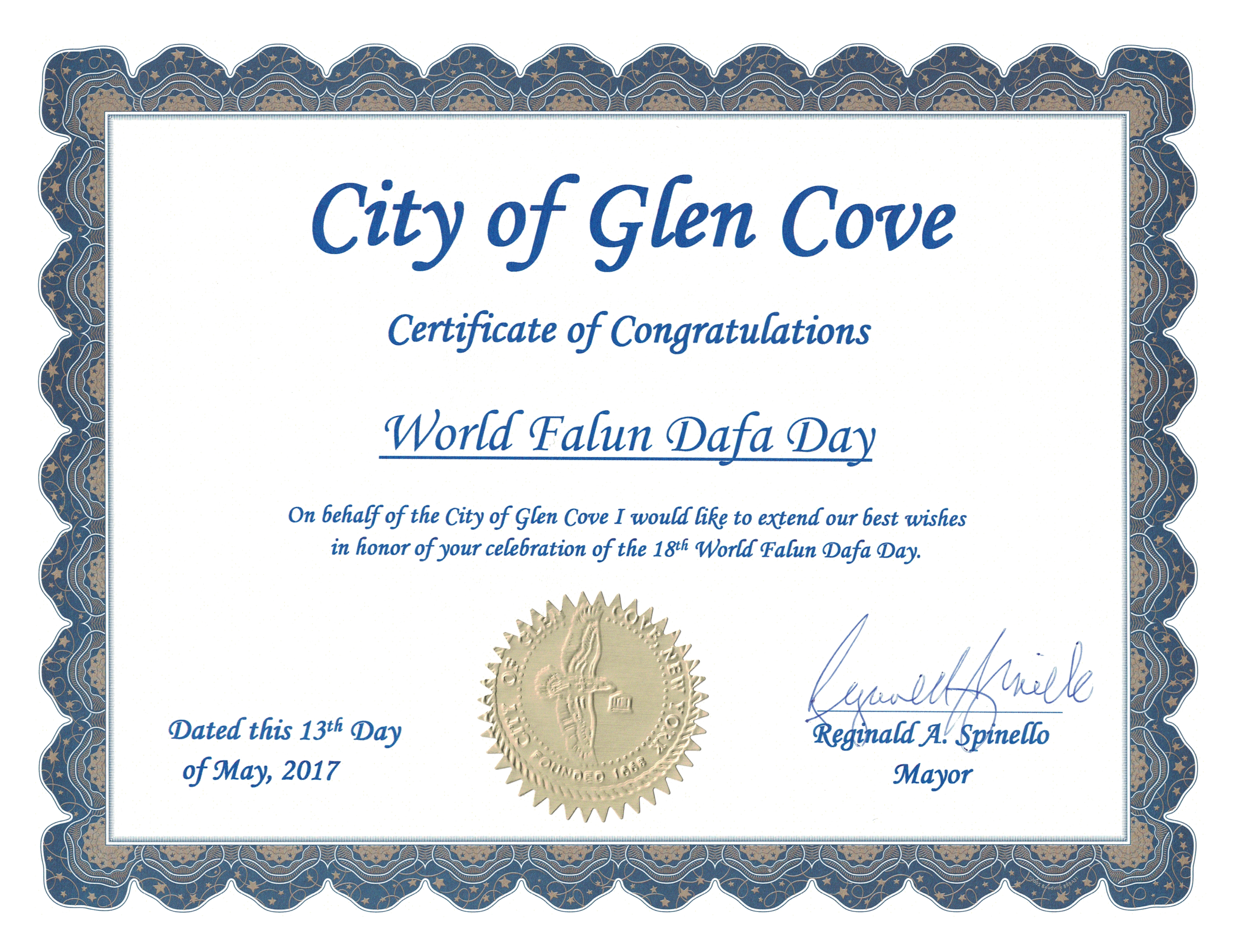 紐約長島格倫科夫市(Mayor of Glen Cove)市長雷金納•德斯皮內洛(Reginald Spinello)頒發褒獎證書,慶祝第十八屆世界法輪大法日。