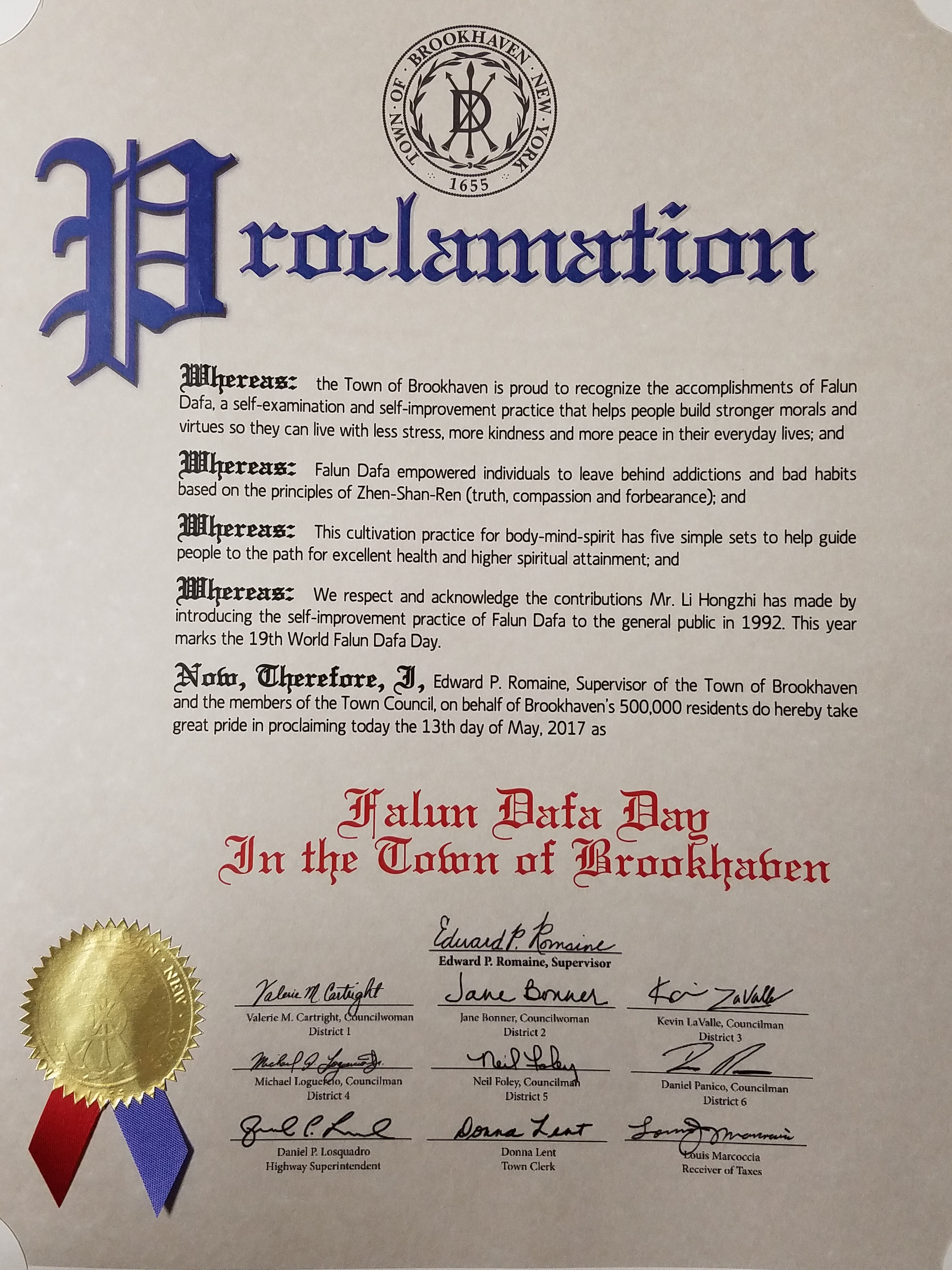 紐約長島布魯克海文鎮(Town of brookhaven)鎮長愛德華•羅曼鎮(Edward P. Romaine) 頒發褒獎,讚揚法輪大法的「真、善、忍」理念以及法輪大法給人類帶來的巨大福祉,感謝李洪志大師的傑出奉獻,並代表布魯克海文鎮五十萬民眾驕傲地宣布二零一七年五月十三日為布魯克海文鎮的法輪大法日。
