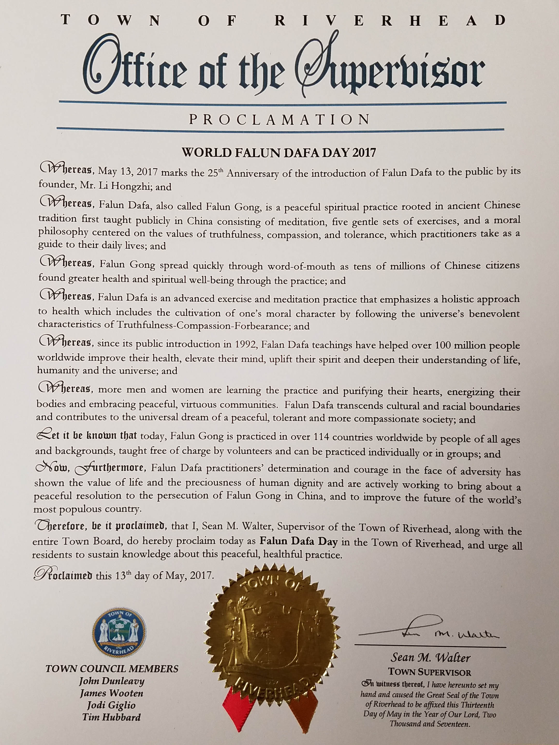 紐約長島河源鎮鎮長(Town of Riverhead)肖恩•沃爾特(Sean M. Walter)頒發褒獎,讚揚法輪大法給人們帶來的福祉,並宣布二零一七年五月十三日是河源鎮的世界法輪大法日。