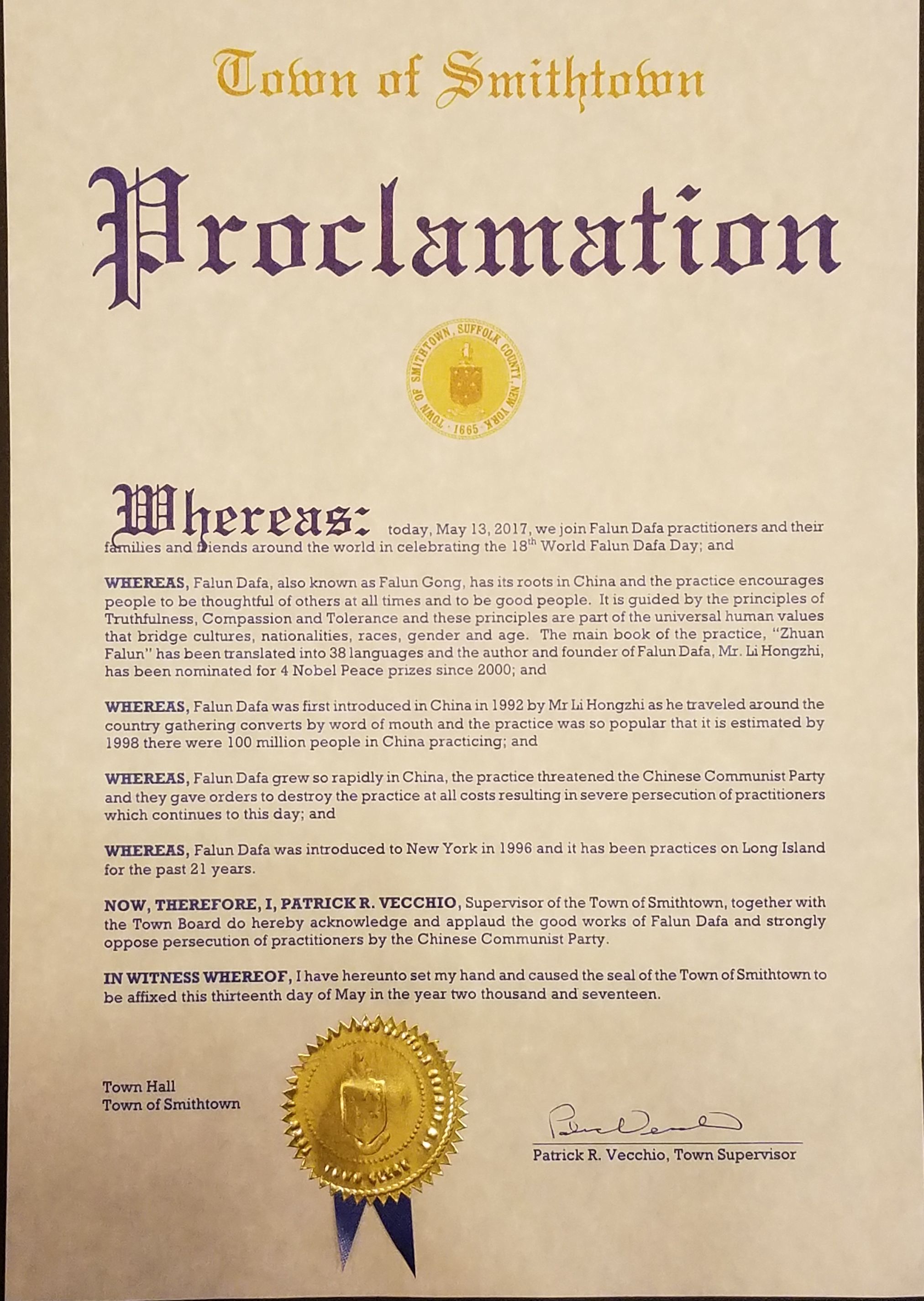 紐約長島史密斯敦鎮鎮長(Town of Smithtown)帕特裏克﹒衛翹(Patrick R. Vecchio)頒發褒獎,盛讚法輪大法給人們帶來的福祉,強烈反對中共迫害法輪大法修煉人。並宣布二零一七年五月十三日是史密斯敦鎮的世界法輪大法日。