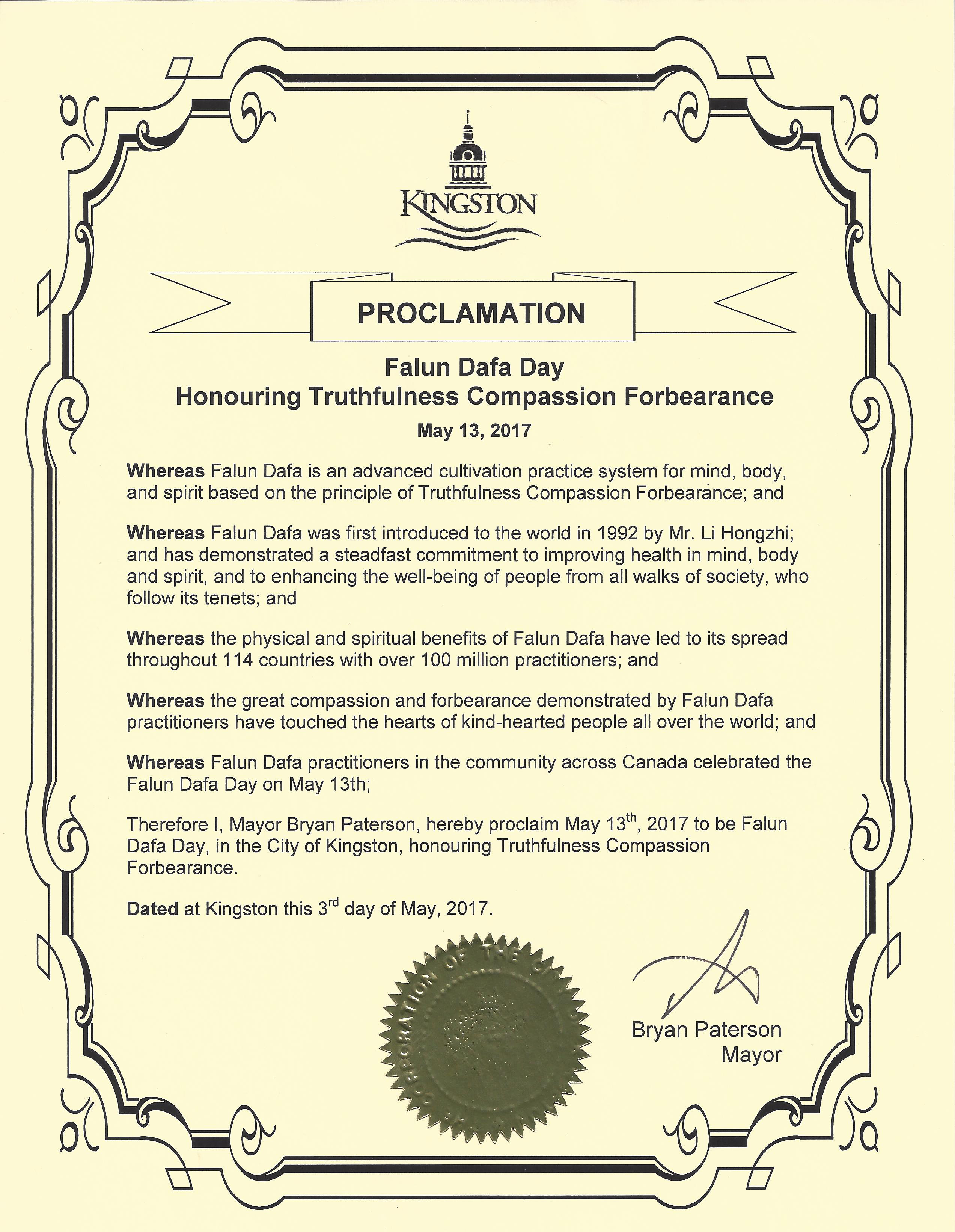 加拿大安大略省金斯敦市宣布二零一七年五月十三日為「法輪大法日」 頌揚「真善忍」的原則。金斯敦市已連續九年褒獎法輪大法日。
