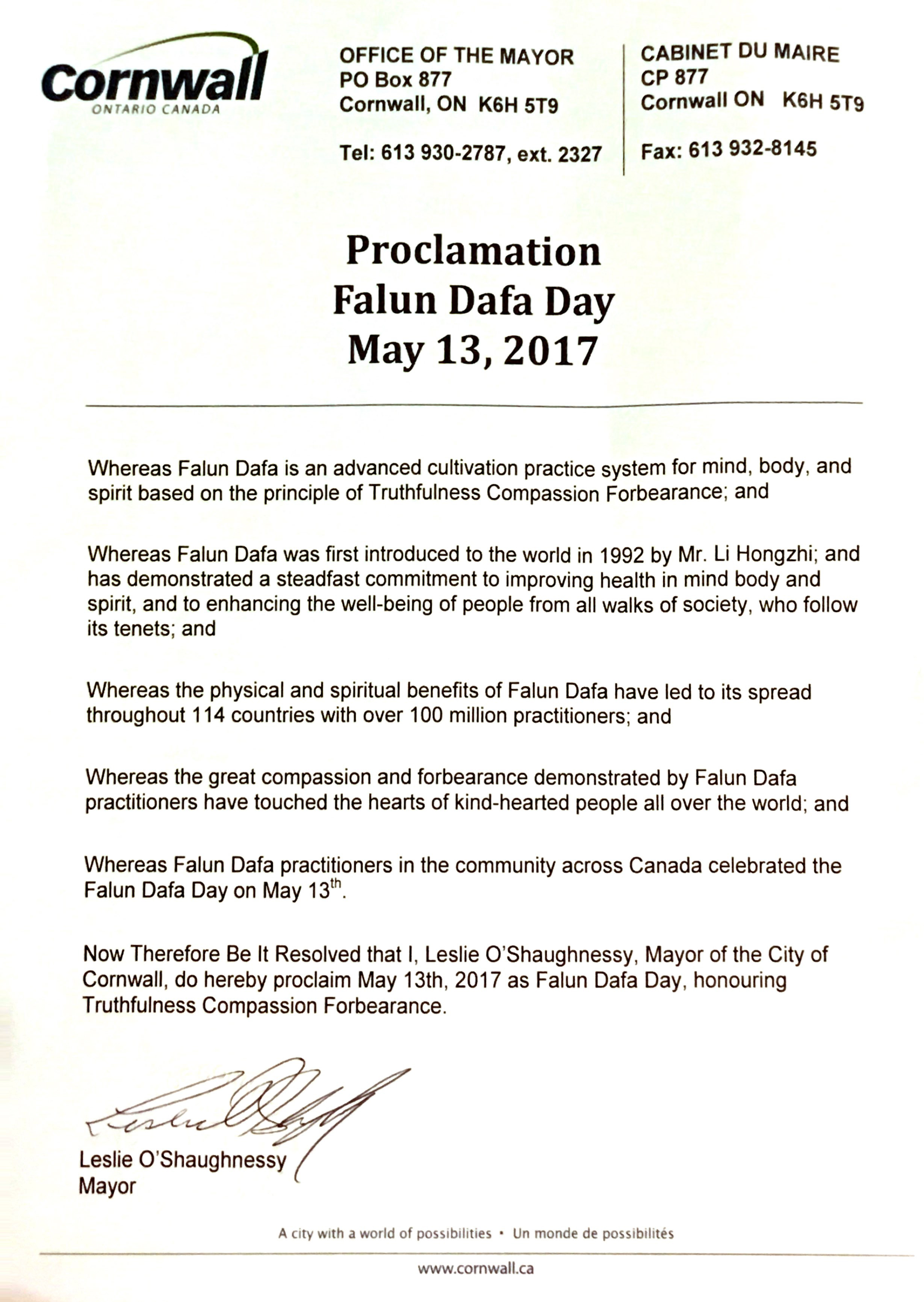 現茲決議,我本人,萊斯利‧奧商奈西,作為康沃爾市市長,正式宣布二零一七年五月十三日為「法輪大法日」,褒獎「真、善、忍」。