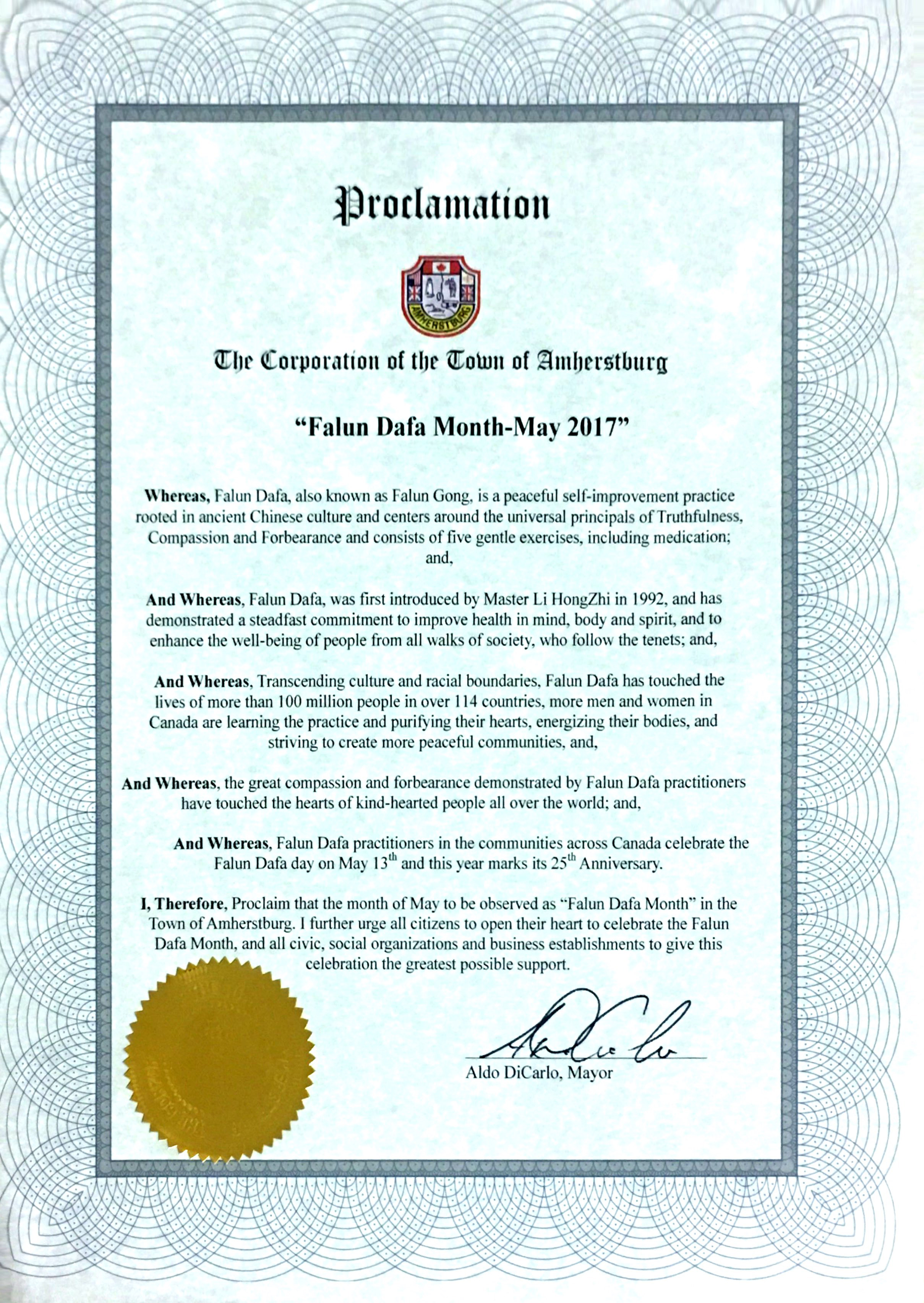 安省阿默斯特堡鎮(Town of Amherstburg)市長Aldo DiCarlo也頒發了褒獎令,宣布「二零一七年五月為法輪大法月」。並鼓勵當地民眾和法輪功學員們一起慶祝法輪大法月。褒獎令中說:「我進一步敦促所有公民敞開心扉,開心慶祝法輪大法月,所有公民,社會團體和商業機構都給予這個慶祝活動盡可能最大的支持!」