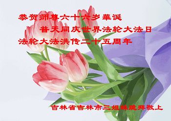 吉林省吉林市三姐妹恭賀世界法輪大法日!