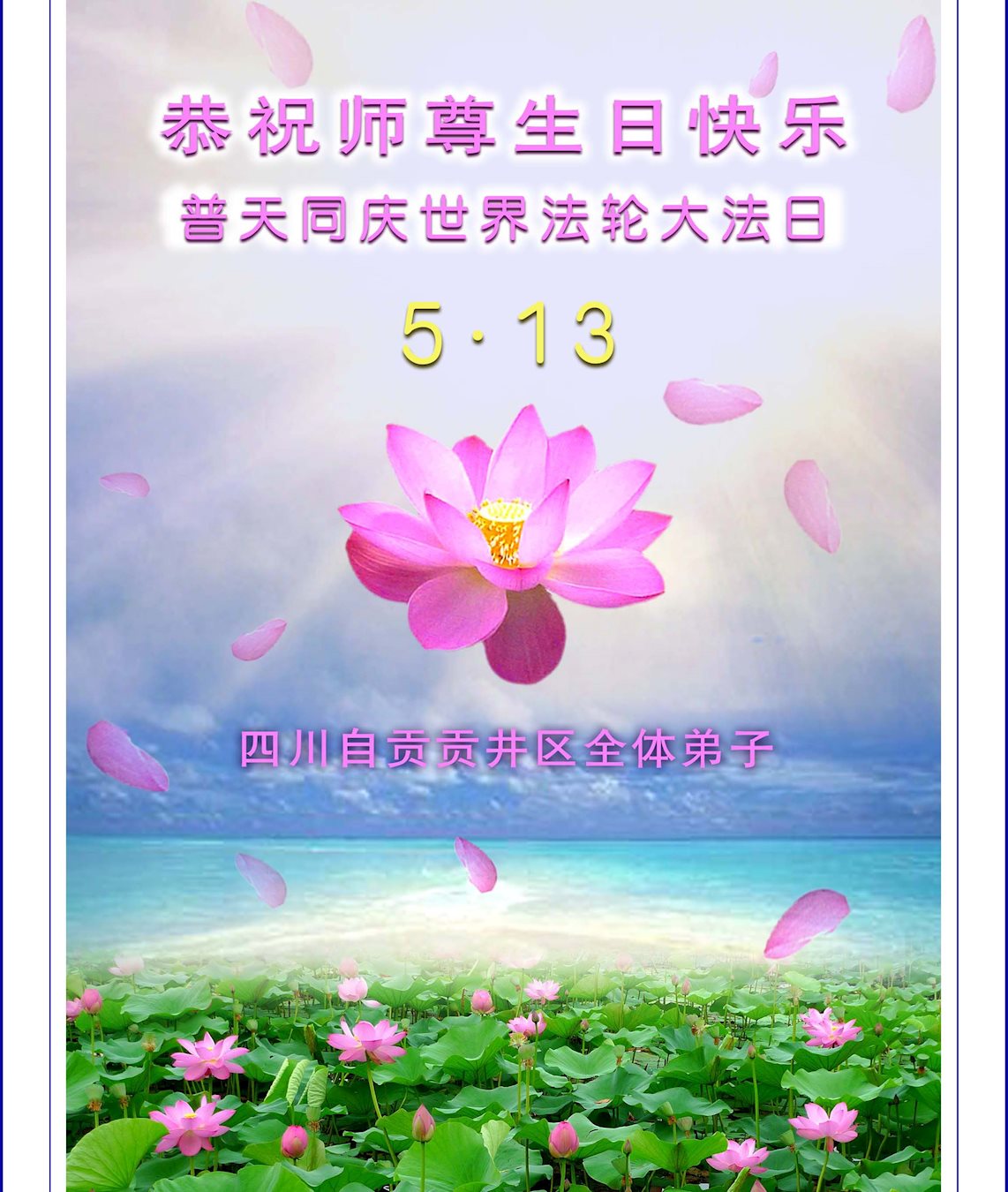 恭祝慈悲偉大的師尊生日快樂!弟子們想師尊!衷心的感謝慈悲偉大師尊的救度之恩!我們一定要以信師信法、多學法、學好法、提高心性、向內找、快救人、多救人、做好三件事和師父回家的實際行動來報導師恩!熱烈慶祝「5.13」世界法輪大法日!
