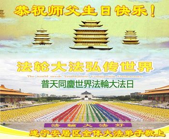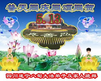 四川遂寧安居區全體大法弟子恭祝慈悲偉大的師父生日快樂!普天同慶法輪大法日!