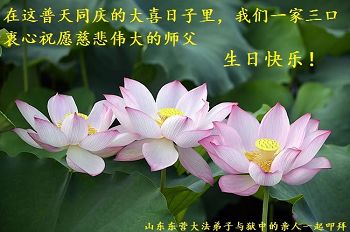 山東東營大法弟子一家三口與獄中的親人衷心祝願慈悲偉大的師父生日快樂!