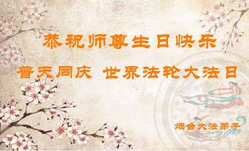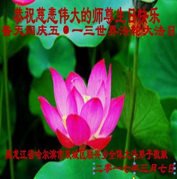 世界法輪大法日和師尊華誕即將來臨,在這普天同慶,眾生永世慶祝的日子裏,弟子給慈悲偉大的師尊叩拜!祝師尊生日快樂!拜謝師尊救度之恩!我是一名得法十九年的大法弟子,這些年經歷的風風雨雨在師尊的精心看護下,在大法中,在同修的幫助下走到了今天,無法用語言來表達自己的感激之情。大法弟子只有牢記師尊的教誨,絕不負師尊的慈悲苦度,在正法的最後之際,按著大法的標準不斷的嚴格要求自己,多學法,學好法修正自己努力做好三件事,完成助師正法的洪願,做一名合格的正法時期的大法弟子。