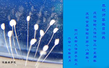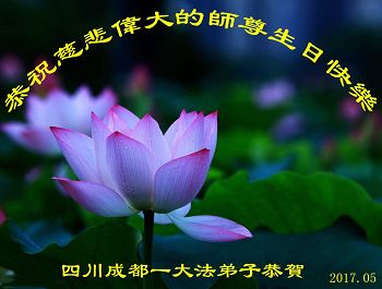 弟子一定按照師父的要求做好三件事,向內找根本執著,跟師父回家。還有我的女兒未正式修煉,她也要恭祝師父生日快樂!她全力支持我修煉,在20天前找到了一份讓我和她都省時省心的好工作,她一定要給師父說謝謝師父!謝謝師父!