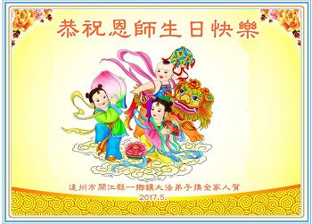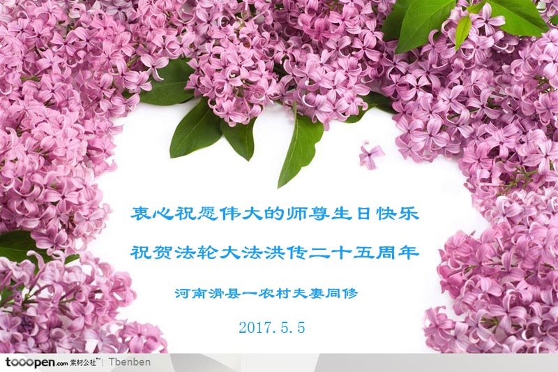在五一三這個普天同慶隊偉大時刻,我和我的家人在此恭祝:恭祝慈悲偉大的師尊生日快樂!為了芸芸眾生得救,師父,您辛苦了!在此也祝賀:法輪大法洪傳二十五週年!