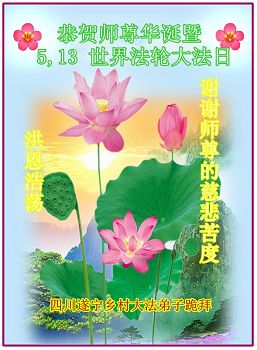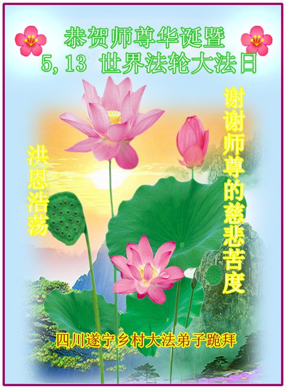 5.13是一個特別偉大的日子,是全世界大法弟子共同的節日。在此我們遂寧市鄉村大法弟子恭祝師尊生日快樂! 師父辛苦了!謝謝師父的慈悲救度!在這正法的最後時間裏,弟子一定珍惜師父以巨大付出所延長來的時間,圓容師父所要的,紮紮實實的做好三件事,學好法,講真相、救眾生,不辜負師父的慈悲救度,不辜負眾生的期盼!惟願師尊笑,圓滿隨師還。叩拜師尊!