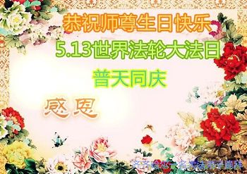 偉大的師尊為挽救大穹,層層下走,到宇宙最低層,歷盡千辛萬苦,層層魔難。弟子無法用人類的語言傾訴對師尊的慈悲苦度感激之情。我倆(夫妻)同修在二十一年修煉中,沒有師父的無微不至的呵護,那是走不到今天的。從頭到腳都是病,是師父為弟子淨化身體,無病一身輕。無論在遇到危險時,在邪惡黑窩迫害中,每時每刻都是在師父的保護下闖過一道道難關,化險為夷。師父為弟子承受得太多,弟子感恩的心在跳動,化作一片片彩雲飄到大洋的彼岸師父的身邊。與全世界大法弟子共同慶祝這偉大的一天,這一天將永遠被歷史銘記。弟子在正法最後的時間裏,只有認真學好法,做好三件事,遇事向內找,修去執著和人心,抓緊救人,才是給師尊最好的禮物。祝偉大的師尊生日快樂!