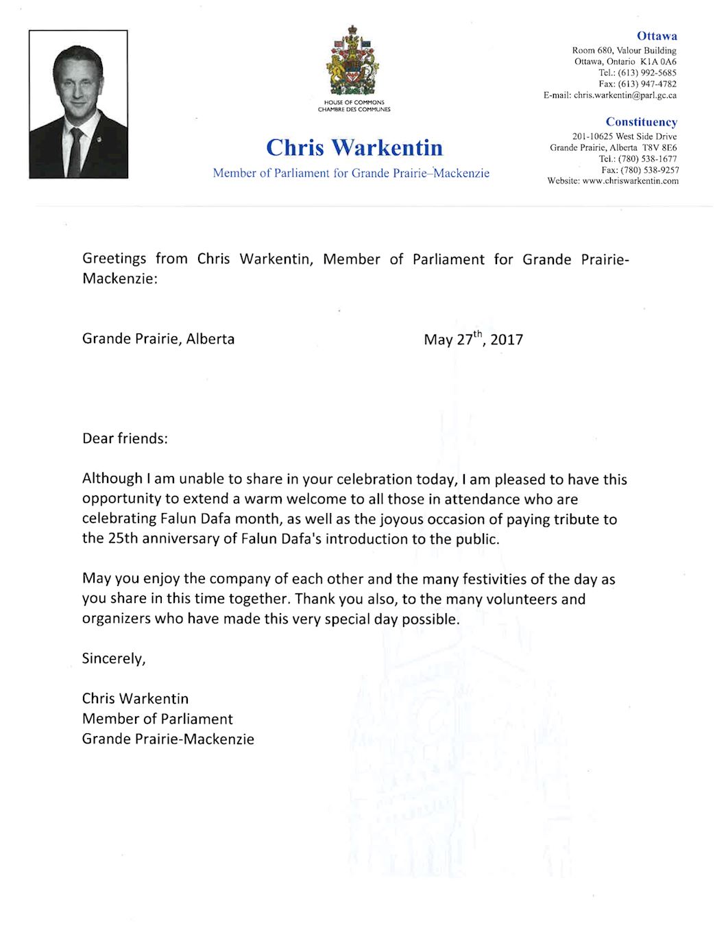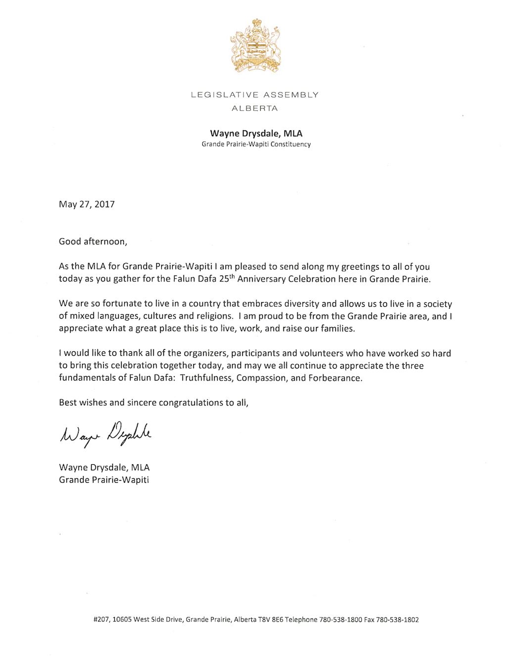 【明慧網二零一七年六月一日】二零一七年五月,加拿大阿伯塔省(Alberta)大草原市(Grande Prairie)市長和國會議員克里斯﹒沃肯庭,省議員韋恩﹒賴斯戴爾和省議員托德﹒羅文頒發褒獎狀或賀信,褒獎法輪功以及「真善忍」價值。