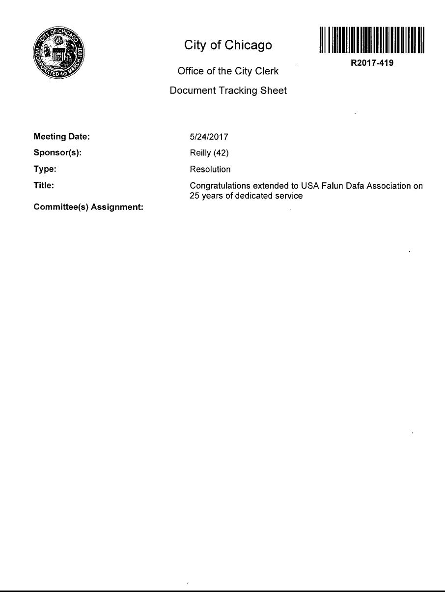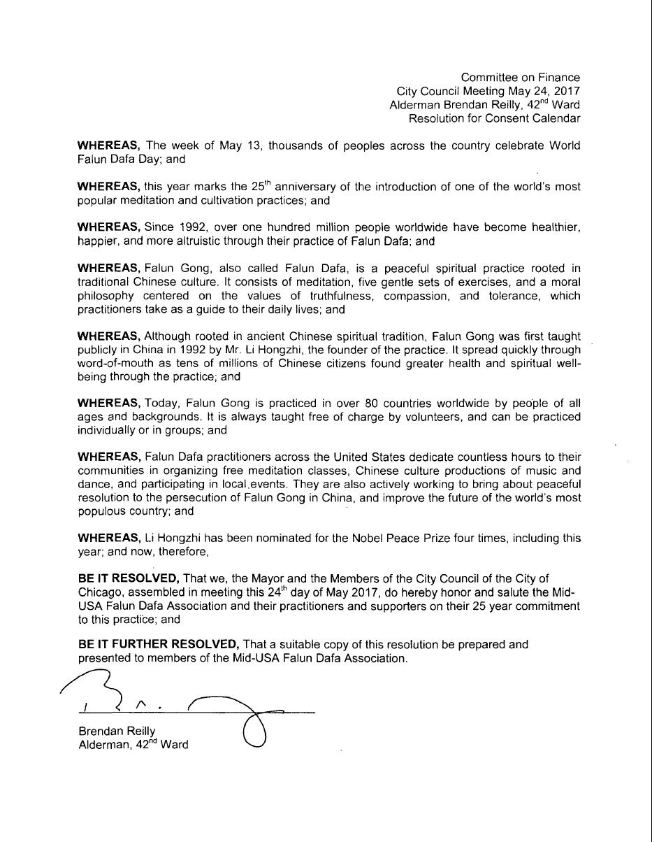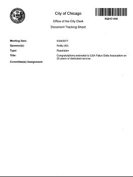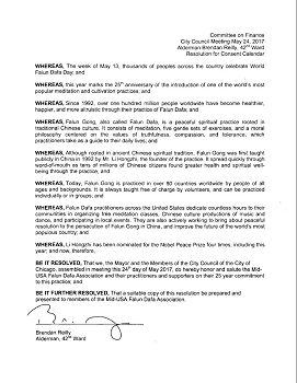 基於此,我們──芝加哥市長和芝加哥市議會的成員們,在二零一七年五月二十四日舉行會議,向美中法輪大法學會和法輪大法修煉者們致敬,慶祝法輪大法弘傳二十五週年。