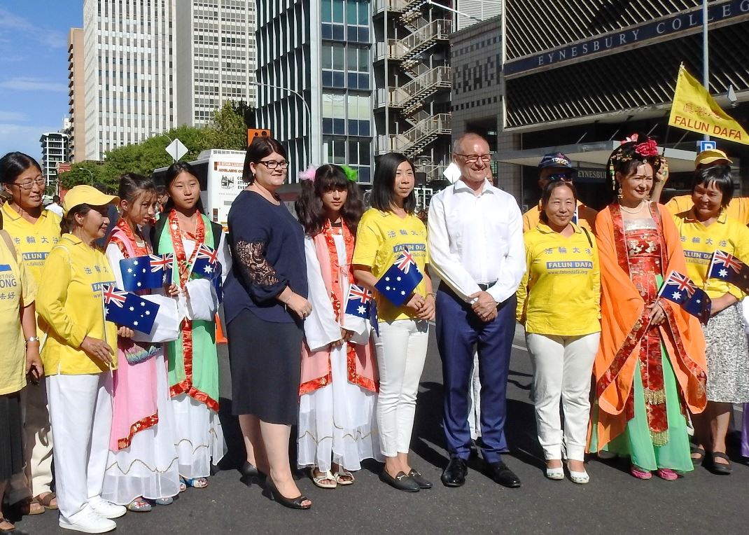 在走近終點的艾爾德公園時,阿德萊德市長哈斯先生(Martin Haese)看到法輪大法學員的隊伍,像遇見老朋友一樣高興地跟大家揮手。主持人在介紹法輪功隊伍時說道:「現在走過來的是法輪大法團體,他們以蓮花、古典服飾為特點。蓮花象徵著純潔、高雅、超然的精神內涵。法輪大法是來源於古老中國的一種以『真善忍』為原則的精神修煉。」