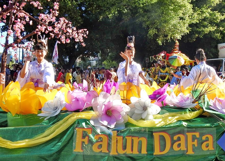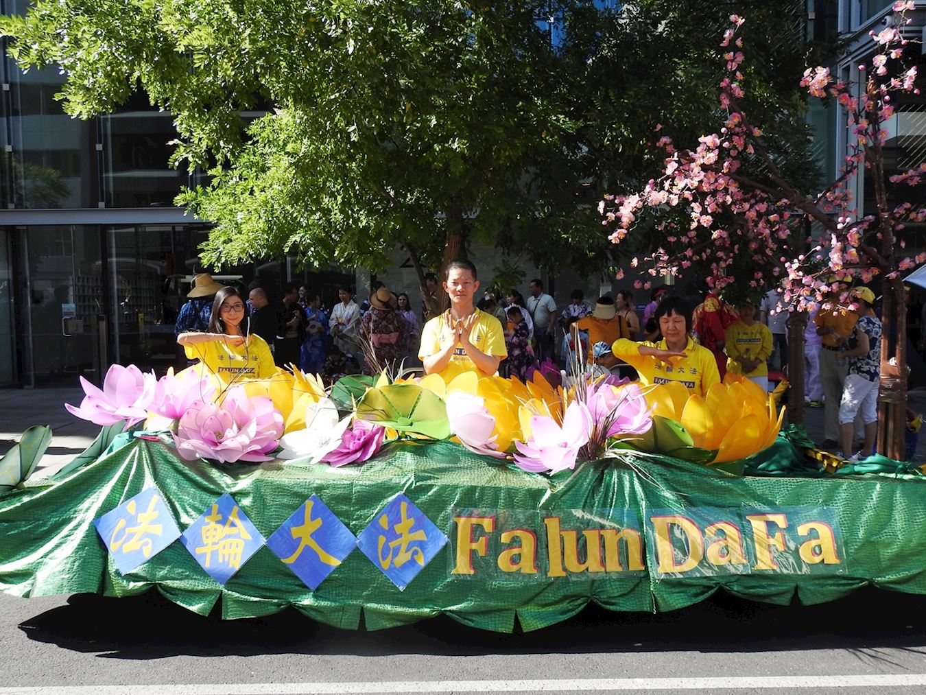 今年的澳洲國慶日,正值南澳阿德雷德持續高溫天氣,儘管活動安排在傍晚6時,室外仍然酷熱。但人們熱情不減,盛裝慶祝。法輪功學員製作的花車特別出眾,是本次遊行的亮點。以蓮花、梅花、修煉文化為主題的花車,端莊華美的古典中華服飾、「世界需要真善忍」橫幅,以及學員們祥和的神態、純善的笑容,吸引著沿途觀眾,他們發出由衷的喝彩、熱情鼓掌。很多人舉起相機、手機拍下珍貴的瞬間,讚歎、掌聲、歡呼一路伴隨著法輪大法學員的隊伍。