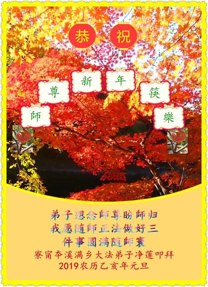 也謹代表本溪全體大法弟子恭祝師父2019年新年快樂!感謝師父的慈悲苦度!叩拜師父的浩蕩師恩!唯精進、做好三件事敬獻師父薄禮!合十