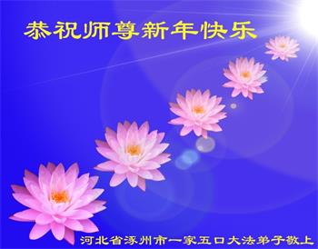 雄縣一大法弟子代表妻子同修以及兒子、兒媳,還有兩個小孫女,給慈悲偉大的師尊祝願新年。弟子合十,叩拜師尊:祝願慈悲偉大的師尊新年好!