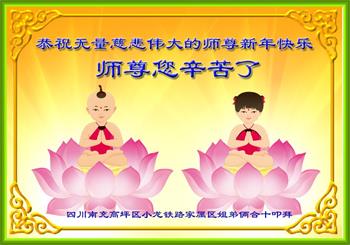 恭祝無量慈悲偉大的師尊新年快樂!師尊您辛苦了!感恩師尊賜給我們法輪大法!感恩師尊淨化了我們的身心,讓我們在法輪大法這一片淨土中健康快樂!的成長,知道了生命的真諦和為別人著想的快樂!四川南充高坪區小龍鐵路家屬區姐弟倆合十叩拜!