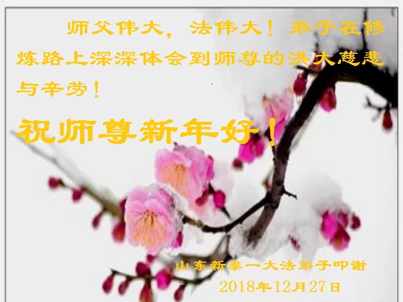 二零一九年元旦來臨之際,向偉大慈悲的師父問好:師尊您好!您為弟子平衡了生生世世的恩怨,承受了我們生生世世的業力,把我們從地獄撈起,給予淨化心靈和身體,真是太辛苦了。弟子只有多學法、向內修、多救人做好三件事,對師尊是唯一的一點報答。