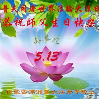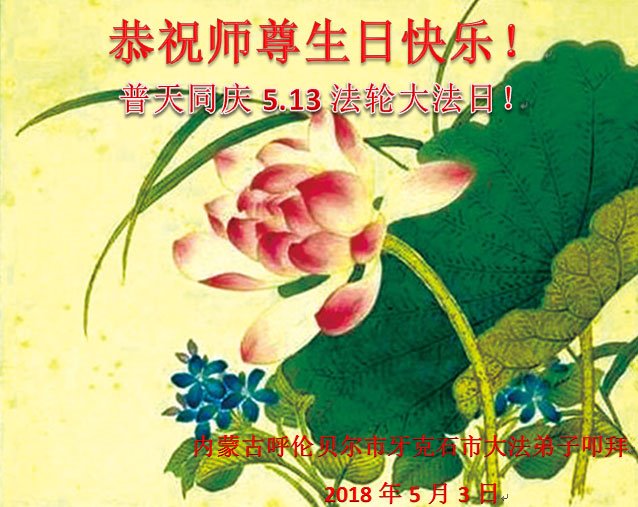 內蒙古自治區呼倫貝爾市海拉爾區一學法小組大法弟子恭祝慈悲偉大的師尊生日快樂!恭賀世界法輪大法日!
