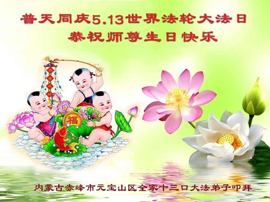 在十九屆5.13世界法輪大法日到來之際,弟子代表家人感恩大法慈悲救度,恭祝偉大的師父生日快樂!普天同慶世界法輪大法日!叩謝師父洪恩!