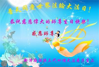 弟子全家懷著對師父,對大法無限感恩的心情,恭祝師尊生日快樂!慶祝世界法輪大法日!