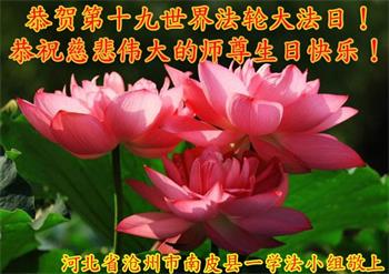在第十九屆世界法輪大法日到來之際,河北省滄州市南皮縣一學法小組的弟子們恭祝師尊生日快樂!感恩師父的慈悲救度!師父您辛苦了!在過去的一年中,我們這些弟子在師尊的加持和鄰縣同修的幫助下,打破地域界限,形成一個整體,走出去,面對面講清真相,救度世人,風雨無阻,堅持至今。希望更多的同修突破自我,走出來,救度更多的眾生。也願更多的世人早日明白真相,早日得到救度!