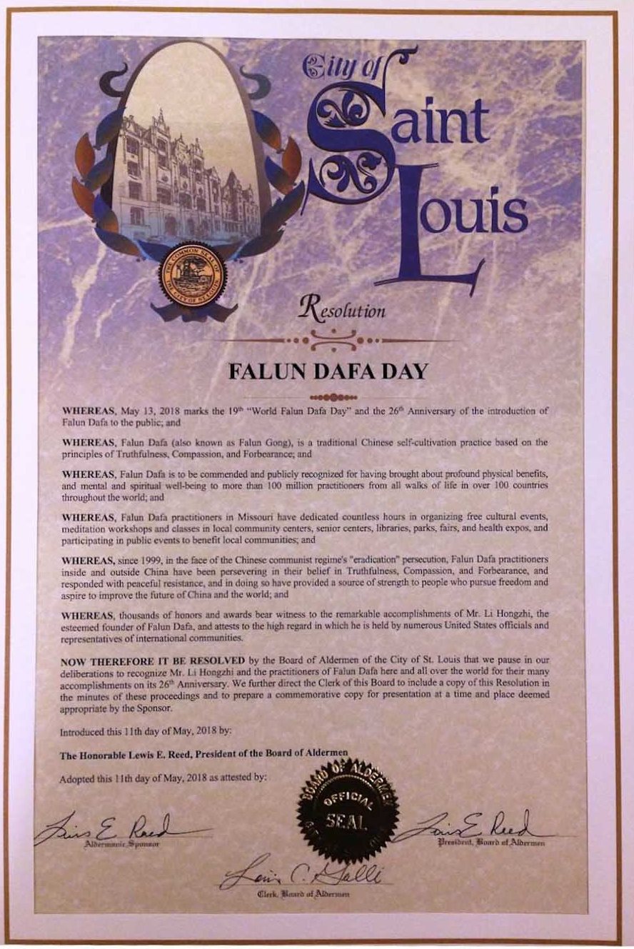 鑑此,聖路易市議會在(大法弘傳)二十六週年之際,讚揚李洪志先生和當地及全世界法輪大法修煉者的巨大成就,並且,市議會書記要準備一份本決議紀念性副件,在適當的時間頒發給受褒獎者。