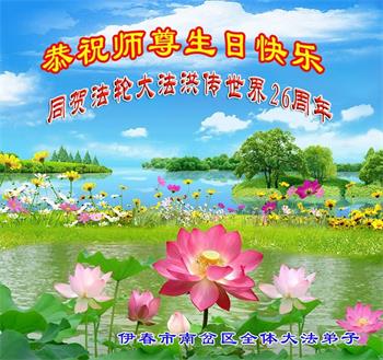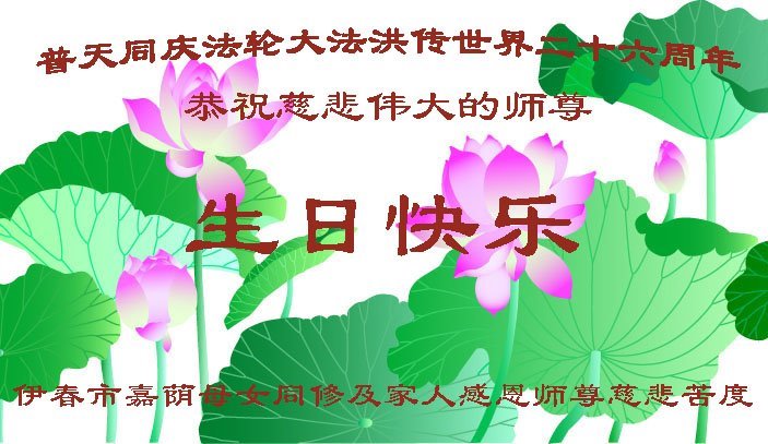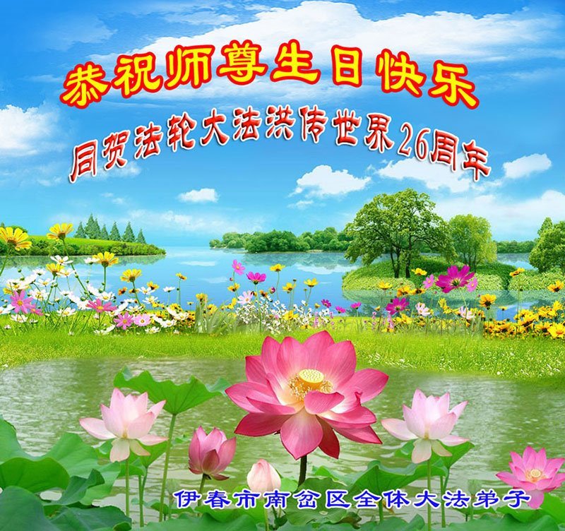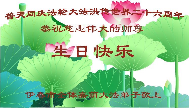 黑龍江省伊春全體嘉蔭大法弟子恭祝慈悲偉大的師尊生日快樂!恭祝法輪大法洪傳世界二十六週年!