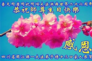 四川省達州市開江縣一大法弟子攜十三口家人恭祝師尊生日快樂!普天同慶同祝同頌大法洪傳世界二十六週年!