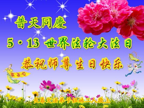 吉林省長春大法弟子姐妹二人恭賀世界法輪大法日!恭祝師父生日快樂!謝謝師父慈悲救度!