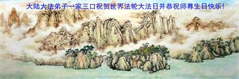 大陸大法弟子一家三口祝賀世界法輪大法日並祝師尊生日快樂!