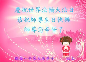 遼寧省鐵嶺一全家大法弟子恭祝師尊生日快樂!