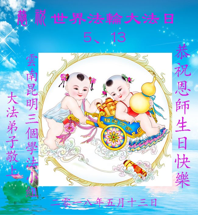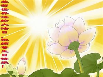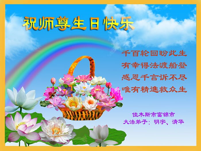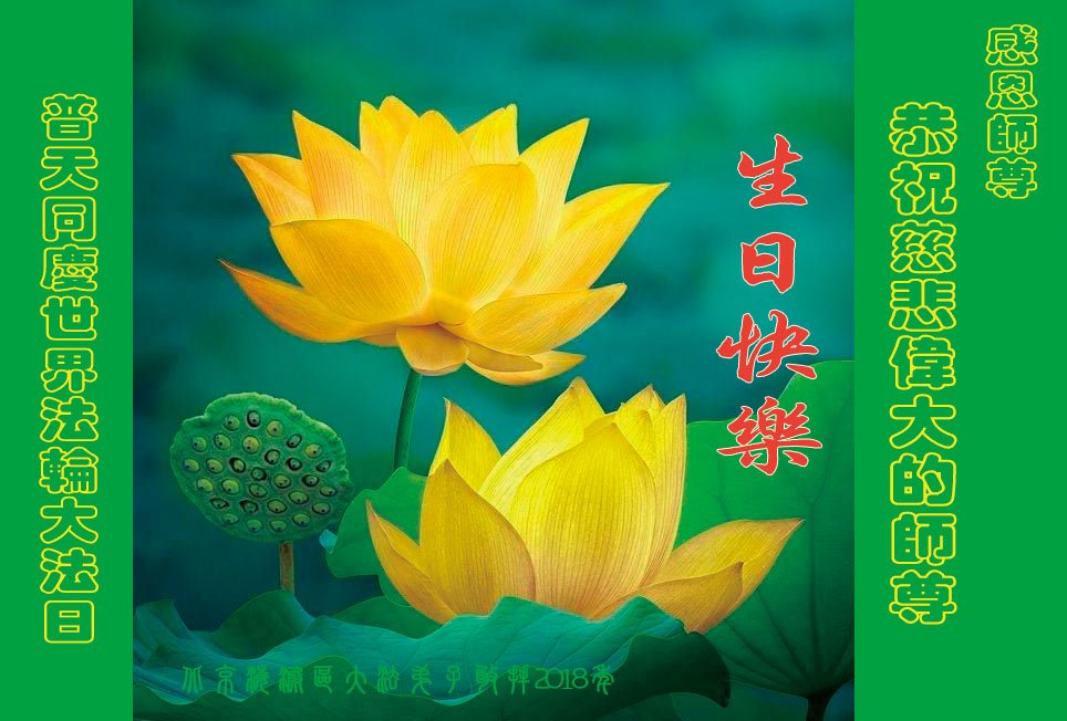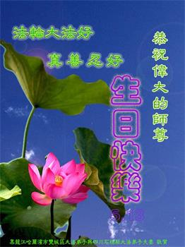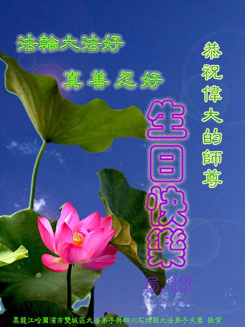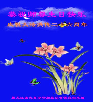 大陸一大法弟子全家恭祝慈悲偉大的師父生日快樂!普天同慶世界法輪大法日及大法洪傳26週年!