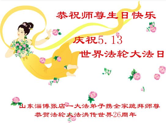山東淄博張店一大法弟子攜全家恭祝師尊生日快樂!恭賀5.13法輪大法日!
