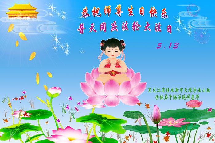 慶祝513世界法輪大法日!恭祝師尊生日快樂!在這幸福的日子裏,每個大法弟子心裏都非常快樂,感恩大法賜予眾生之福,成就了大法弟子的輝煌:天清體透法光照,隔洋叩拜師尊壽。弟子唯有再精進, 惟願師尊聖顏笑。謹遵師父的教誨修好自己、救度眾生。扣上! 黑龍江省尚志市大法弟子全家對師尊的思念和祝願