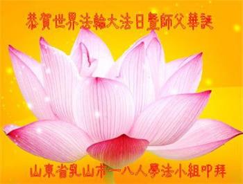 山東省威海市乳山市一八人學法小組恭賀世界法輪大法日暨師父華誕!