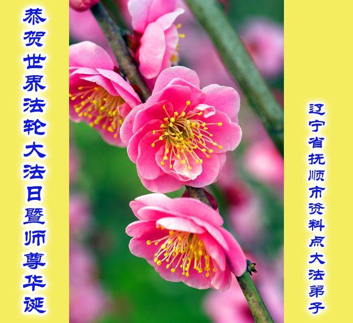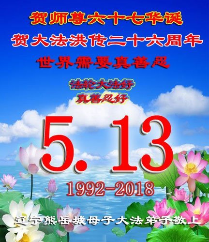 遼寧省撫順市資料點的大法弟子普天同慶2018年世界法輪大法日!恭祝師父華誕快樂!