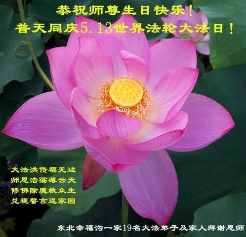 在第十九屆五一三世界法輪大法日來臨之際,我們學法小組的全體學員,無限感恩師父,感恩大法!感謝師父的慈悲救度!自從修煉了法輪大法,我們明白了人來在世上的真正目地是返本歸真。我們體悟到了放下人心執著的輕鬆與美妙!我們經歷了得法後的喜悅,溶於法中,心靈淨化後的超脫。我們在修煉的路上比學比修,勇猛精進;在人類社會中證實大法,反迫害中正念正行,信師信法,有力的震懾了邪惡。在證實法中在師尊的呵護下也出現了很多的神奇事蹟。今後我們更加堅定的走在助師正法,救度眾生的神的路上,在正法的最後階段,努力學法修心,遇事向內找,做好三件事,救度更多的世人。圓滿隨師還!