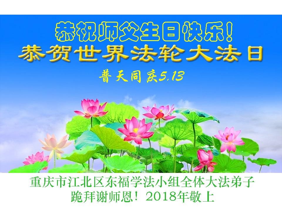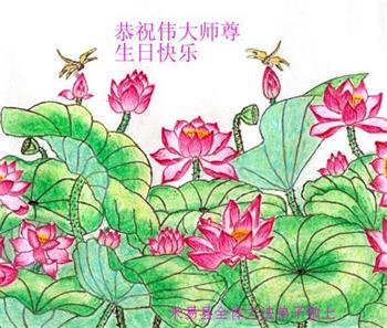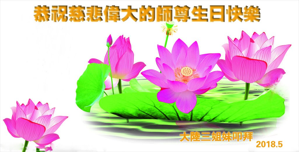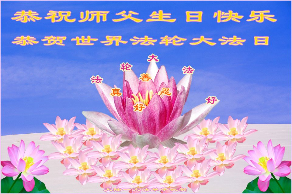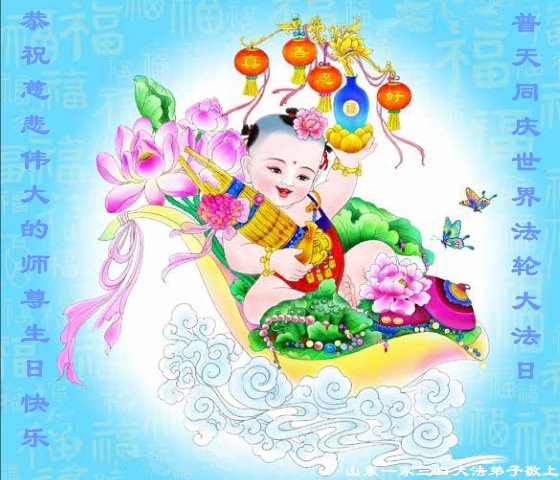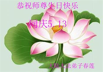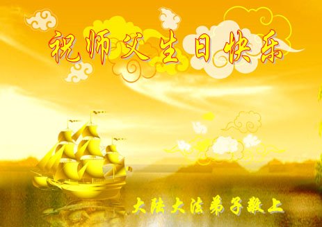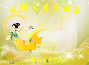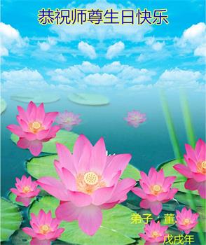 法輪大法好!真善忍好!師父的慈悲苦度,對弟子呵護,無法用語言來表達。在這二十年來,是恩師把我從地獄中撈起,洗淨,除名,淨化了我的身體,使我達到了無病一身輕的狀態,還給我身體裏下上了無比珍貴的東西(法輪),使我能夠在大法中修煉多謝師父的慈悲救度。讓師父操了不少心,在這裏向偉大的師父保證在這最後的時間裏,一定走好最後的路,讓師父放心,堅修大法,一修到底,跟師父回家,祝師父生日快樂!