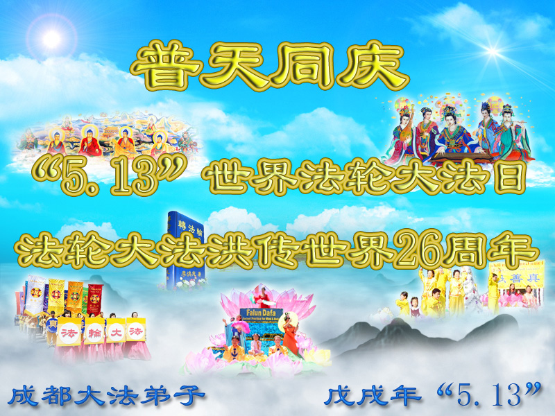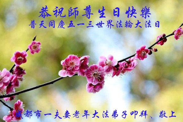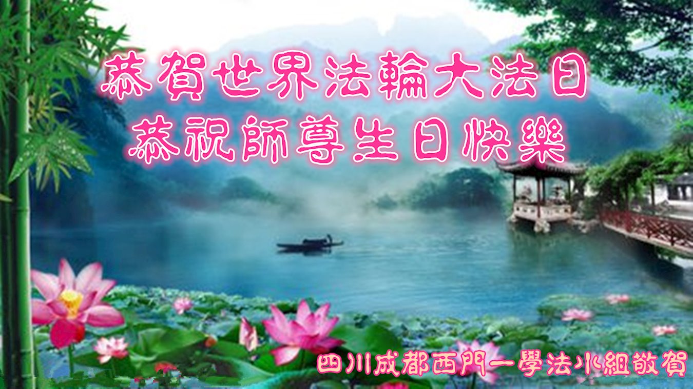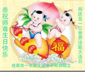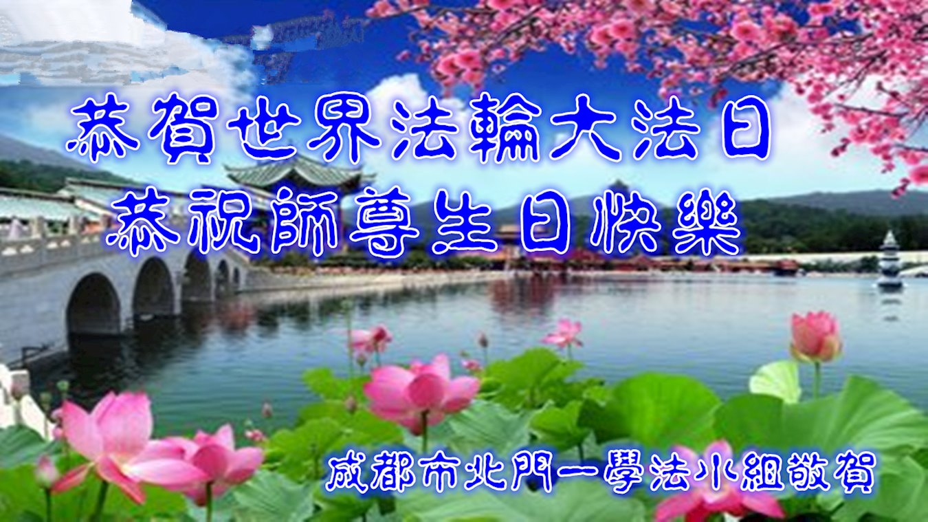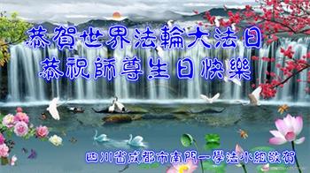 成都市一學法小組全體大法弟子恭祝師尊生日快樂!普天同慶五一三世界法輪大法日!師尊您為救度眾生費盡了您的一切,弟子們努力要求自己要勇猛精進,唯有多學法、多救人回報師恩,請師尊放心!謝謝師尊!成都市一學法小組全體大法弟子叩拜!
