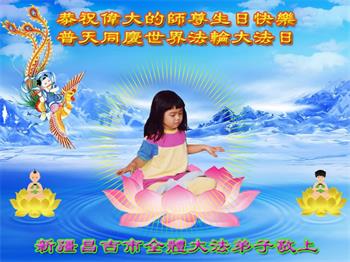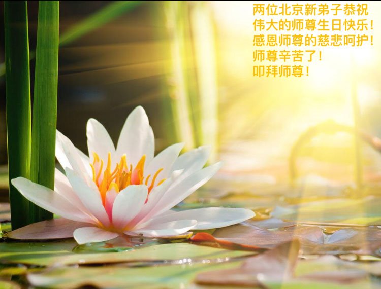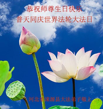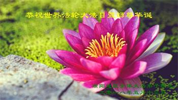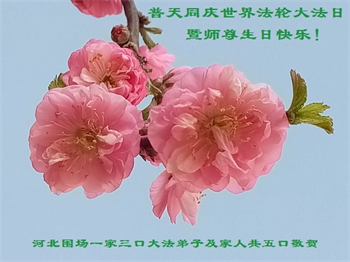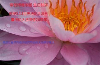 在這普天同慶的日子裏,帶著無比感恩的心恭祝師尊生日快樂!同慶世界法輪大法日!我是一個十幾歲就疾病滿身的人,慶幸的是能趕上大法洪傳,有幸走入大法修煉,師尊為我消去滿身病業,使我身心健康幸福快樂!在這感恩的日子裏,真心希望與大法有緣的人早日走入大法修煉,所有不了解大法真相的人儘快了解真相,別錯過這萬古不遇的機緣!想說的話太多,在這感恩的日子裏:感謝師尊把我從地獄裏撈起,使我不在沉淪墮落,向生命真正的意義啟航!感謝師尊給了我健康,我不再為病痛憂傷;感謝師尊給了我幸福的家庭,我的家人見證了大法神奇明白真相。千言萬語都無法表達對師尊感恩的心。