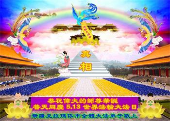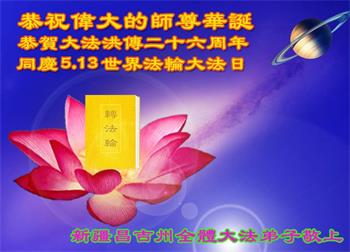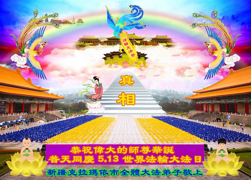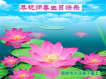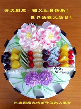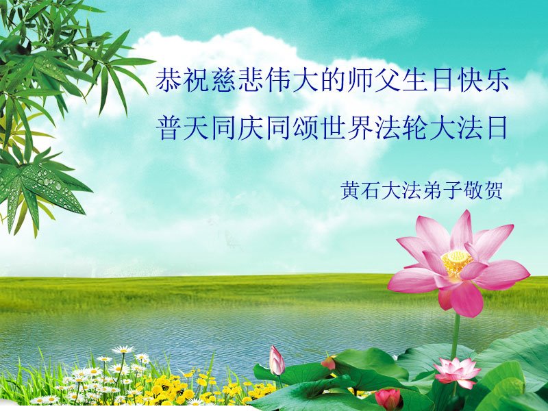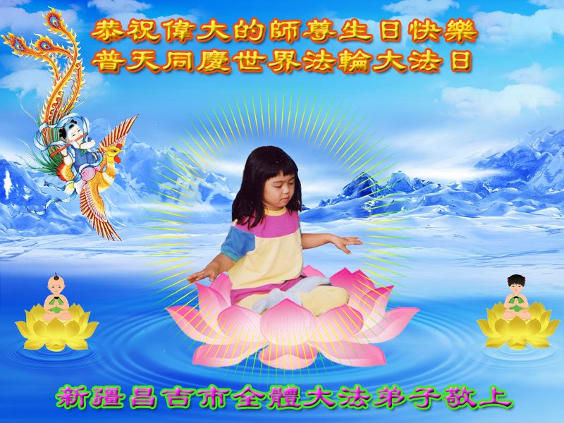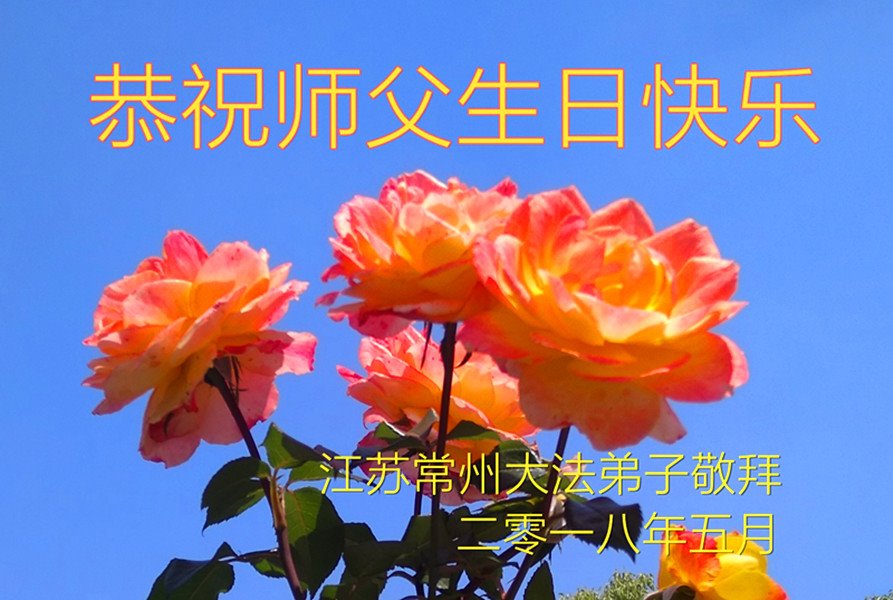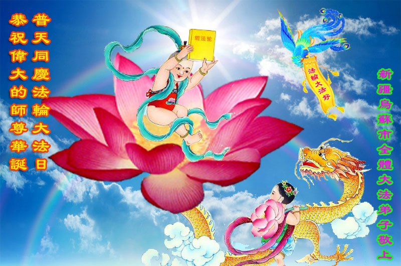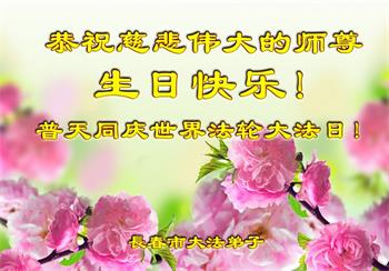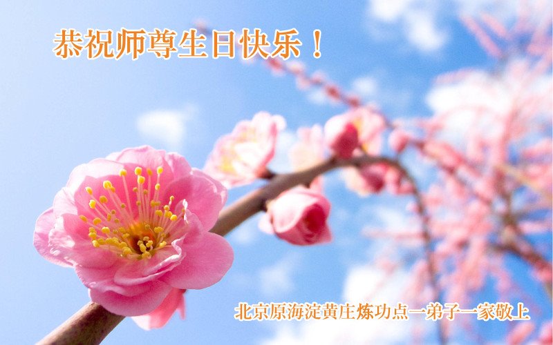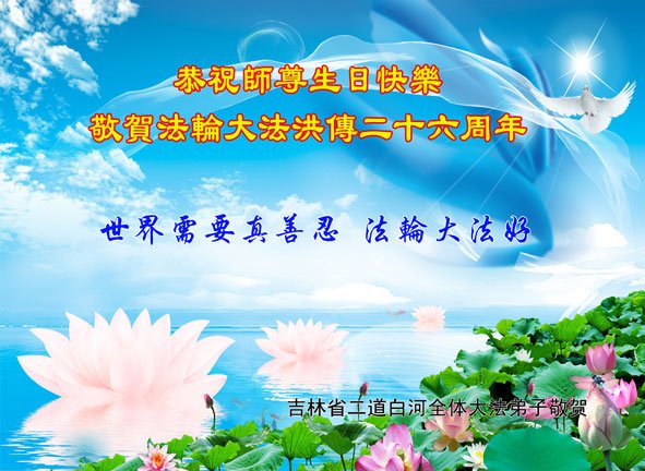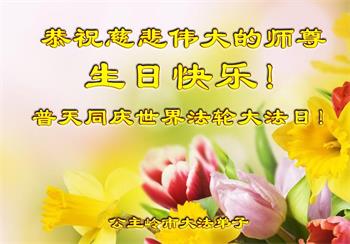 我是九六年得法的弟子,今天兒子(未修煉法輪功)在電話裏請我代表他、兒媳及孫女恭祝慈悲偉大的師尊生日快樂!