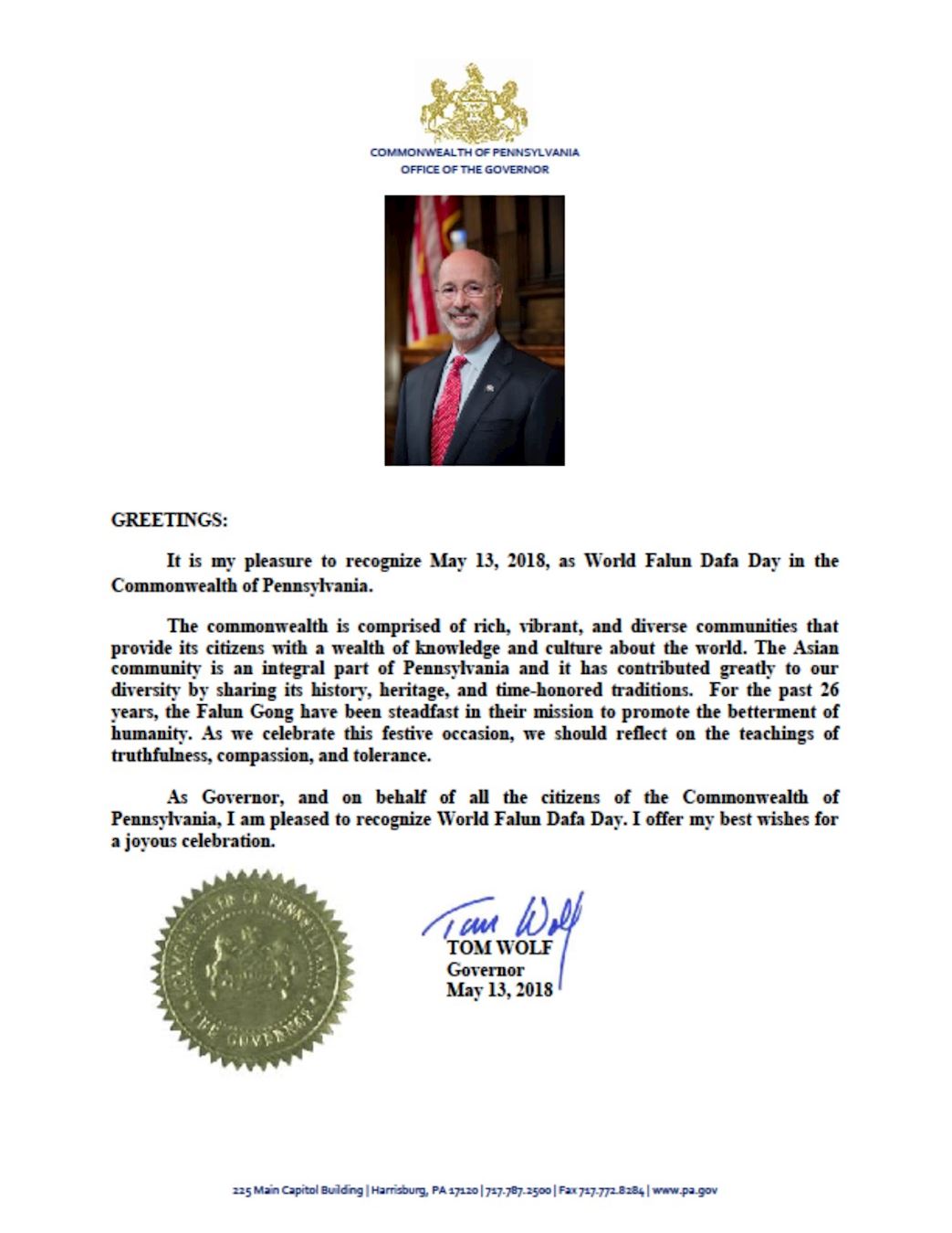 作為州長,並代表賓夕法尼亞州的所有公民,我很高興地褒獎世界法輪大法日。我以最美好祝願祝福這一美好的慶典。