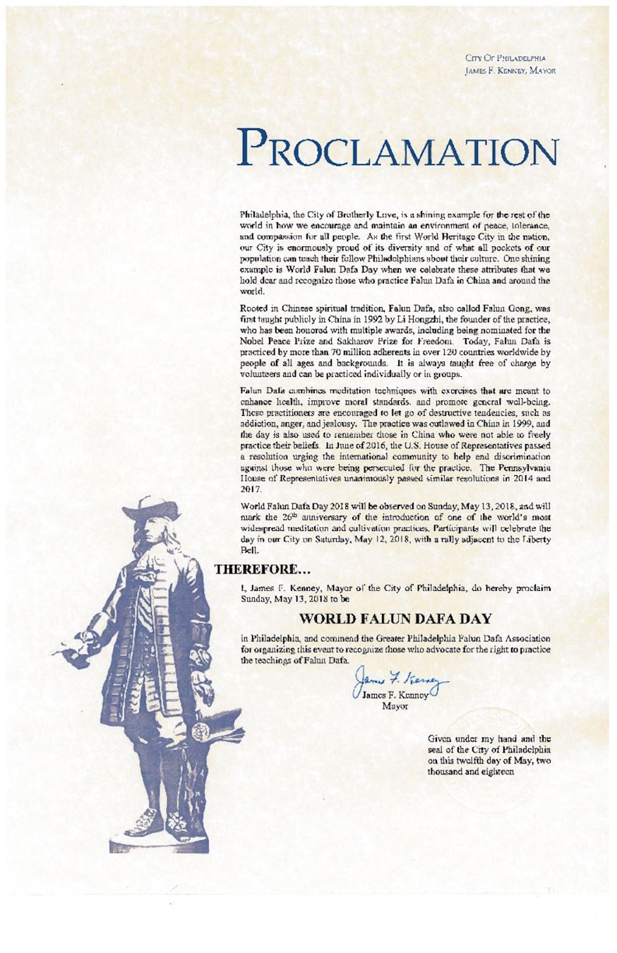 因此我,詹姆斯﹒肯尼,作為費城市市長,宣布二零一八年五月十三日為世界法輪大法日。同時我也表彰大費城地區法輪大法學會舉辦這次活動,感謝其為人們爭取自由煉功環境而作出的努力。