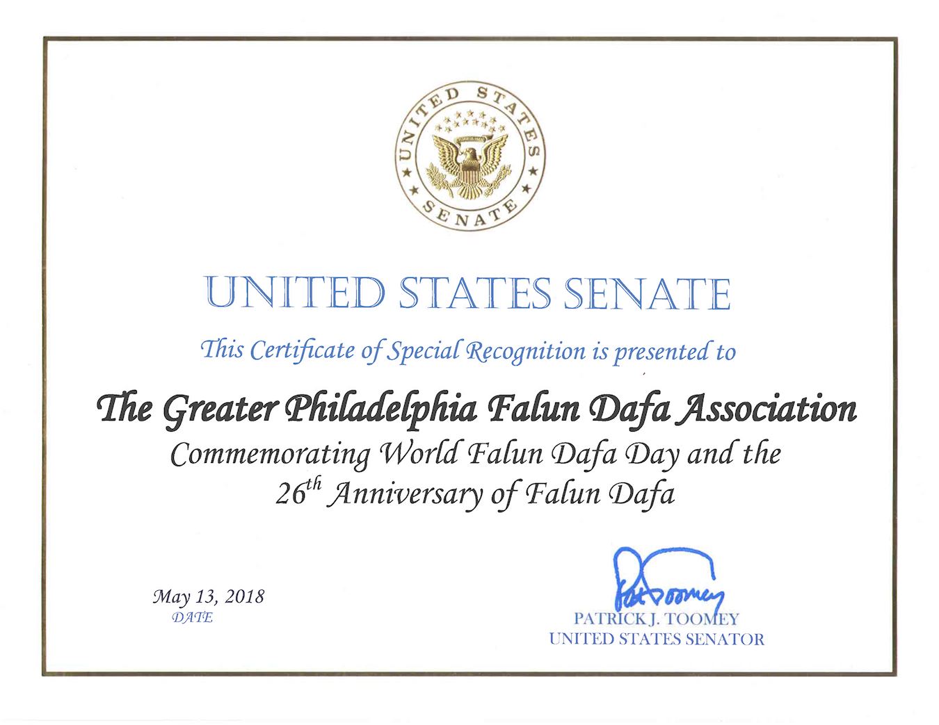 再次感謝能有機會表彰大費城法輪大法學會,並在二零一八年五月十三日你們慶祝「世界法輪大法日」之際送上我最美好的問候。