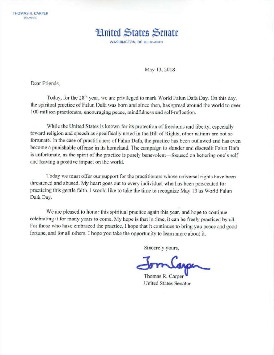 德拉華州國會參議員托馬斯﹒卡波(Thomas Carper)在賀信中說:「親愛的朋友們,今天,在法輪大法傳世二十六年的日子,我們有幸慶祝世界法輪大法日。這一天,是精神信仰法輪大法問世的日子,自問世以來,傳遍到全世界,有超過一億人修煉,促進了和平,正念和自我完善。 美利堅合眾國以保障自由而著稱,尤其是信仰和言論自由,在憲法中被特別強調,其它的國家卻沒有這麼幸運。法輪大法修煉人就是一個例子,這種修煉在自己的國家被禁止被打壓。污衊及詆毀法輪大法的運動是不幸的,法輪大法這個精神層面的修煉是純善的─致力於做好人並給世界帶來了正向的影響。今天我們必須提供我們的支持給那些普世的權利被剝奪和凌虐的修煉者。我的心與每一位因修煉這個祥和的信仰而被迫害的人在一起。我誠摯的表彰五月十三日為世界法輪大法日。今年我們欣慰的再次表彰這個精神信仰,並希望在未來的許多年裏都慶祝這一天,我希望有一天,所有的人都能自由的修煉。我希望修煉一如既往地帶給修煉人祥和與福祉,對尚未修煉的人,我希望你抓住機會了解更多相關資訊。」