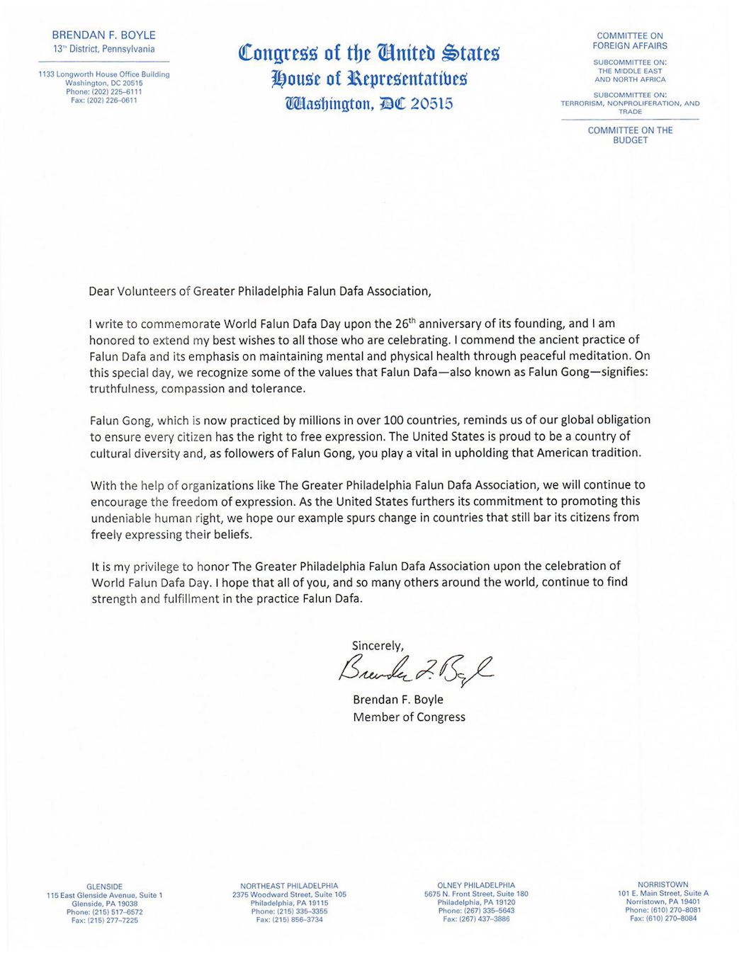 下面是國會眾議員布倫丹﹒博伊爾(Brendan Boyle)致大費城法輪大法學會的賀信的全文翻譯: