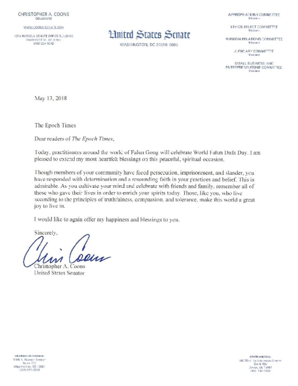 ![]() 圖8:美國國會眾議員克里斯托弗﹒科恩斯(Christopher Coons)在賀信中說:「在這個祥和的精神層面的慶典之際,我高興的送上我發自內心的祝願」,「要記住那些為信仰失去生命的人,那些像你一樣的人,他們生活中遵循『真善忍』的原則,使這個世界變得更美好」。 |